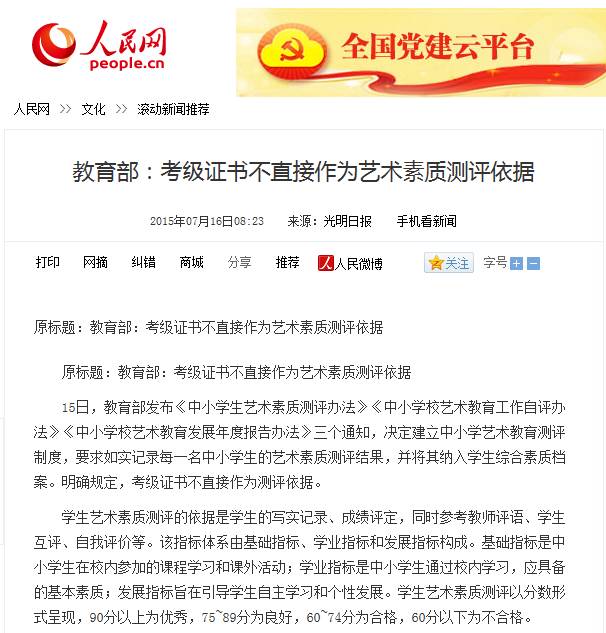 4、测评证书的权威性。很多社会上的机构打着教育部或文化部的幌子,在外夸大事实的宣传。正规的艺术素质教育测评单位所出具的证书的作用是为学生参加学校组织的测评时提高测评适应力,其成绩可作为参加学校综合测评时作为的重要参考依据。