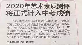 艺术课程学得咋样,还将影响到今后升学。南京将全面探索实施美育质量监测。《意见》提出,南京将按照《中小学生艺术素质测评办法》,开展南京市中小学艺术素质测评试点工作。到2020年,全市中小学生艺术素质测评覆盖率达到100%,小学生艺术素质测评结果纳入素质报告书,初中毕业生艺术素质测评结果计入中考成绩,普通高中艺术课程纳入学业水平测试并作为高校艺术专业录取依据。